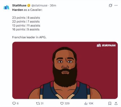 哈登被交易到骑士后的四场比赛:23+8、22+7、13+11、16+9,他是同期助攻数最多的那个,他在骑士打控球后卫时骑士的进攻非常流畅。