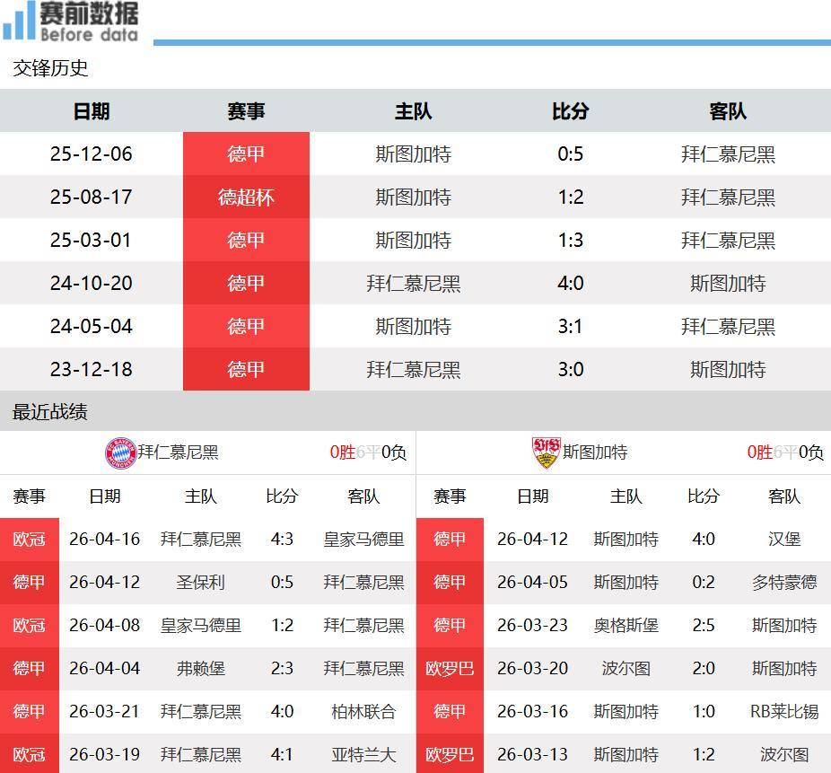 回顾双方上一轮德甲联赛的表现,拜仁慕尼黑在客场以摧枯拉朽之势5-0横扫圣保利,展现了强大的进攻火力。更值得称道的是,在周中的欧洲冠军联赛中,拜仁慕尼黑主场与皇家马德里上演了一场惊心动魄的进球大战,最终以4-3险胜对手,以总比分双杀的方式昂首挺进半决赛,士气正盛。反观斯图加特,他们在主场同样以一场酣畅淋漓的4-0大胜汉堡,将胜利收入囊中,近四轮联赛取得了3胜的佳绩,整体状态相当出色。