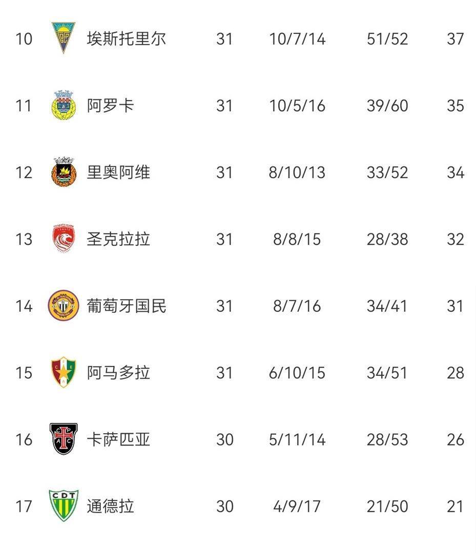 这场平局对葡萄牙体育的排名造成重创。 31轮战罢,葡萄牙体育的成绩为21胜8平2负,累积71分跌至积分榜第三位。 由于本轮轮空,葡萄牙体育目前落后榜首的波尔图11分,在联赛仅剩3轮的情况下,夺冠仅剩理论可能。 不仅如此,他们目前仅领先身后同赛29轮的布拉加4分,欧冠资格也出现了松动。